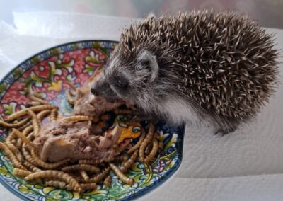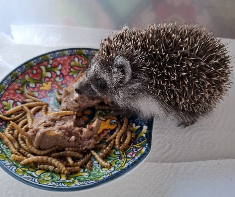 Igel sind Fleischfresser und ernähren sich in der freien Wildbahn vorwiegend von Käfern, Asseln, Würmern, Schnecken, kleinen Wirbeltieren und auch Aas. Mit selbst gefangenen Schnecken und Würmern solltest du einen Igel allerdings nicht füttern, da diese Parasiten wie Lungen- und Darmlungenwürmber übertragen können. Insbesondere Jungtieren oder bereits geschwächten Igel kann das enorm schaden – schlimmstenfalls sogar tödlich enden. Willst du ein verwaistes Igeljunges selbst aufpäppeln, dann eignet sich Katzendosenfutter (Pastete) dafür. Am besten wählst du eine Sorte ohne Sauce oder Gelee und riskierst damit keinen Durchfall. Wahre Leckerbissen sind lebende Mehlwürmer. Stehen dir nur getrocknete Mehlwürmer zur Verfügung, dann verfüttere diese wesentlich fettere Variante nur in kleineren Mengen. Für die Allerkleinsten bekommst du im Fachhandel auch artgerechte Aufzuchtmilch in Pulverform.